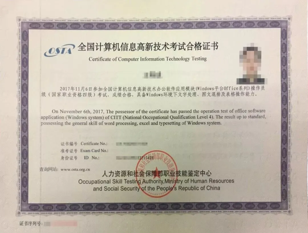 2. 通过考试后可获得国家职业资格办公软件应用操作员(中级/四级)证书,证书为人社局颁发,权威可靠。