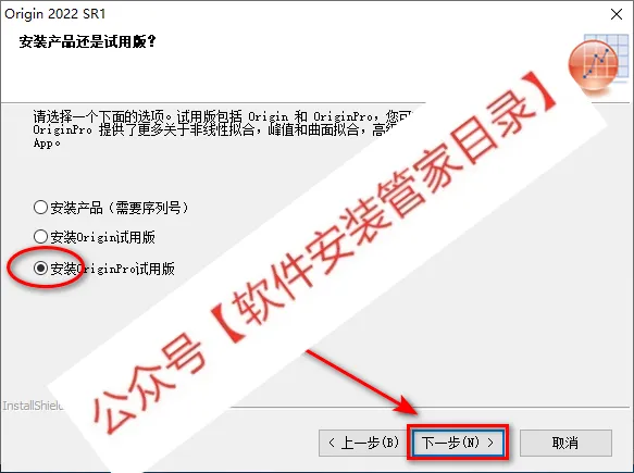 6.选择安装OriginPro试用版,点击“下一步”