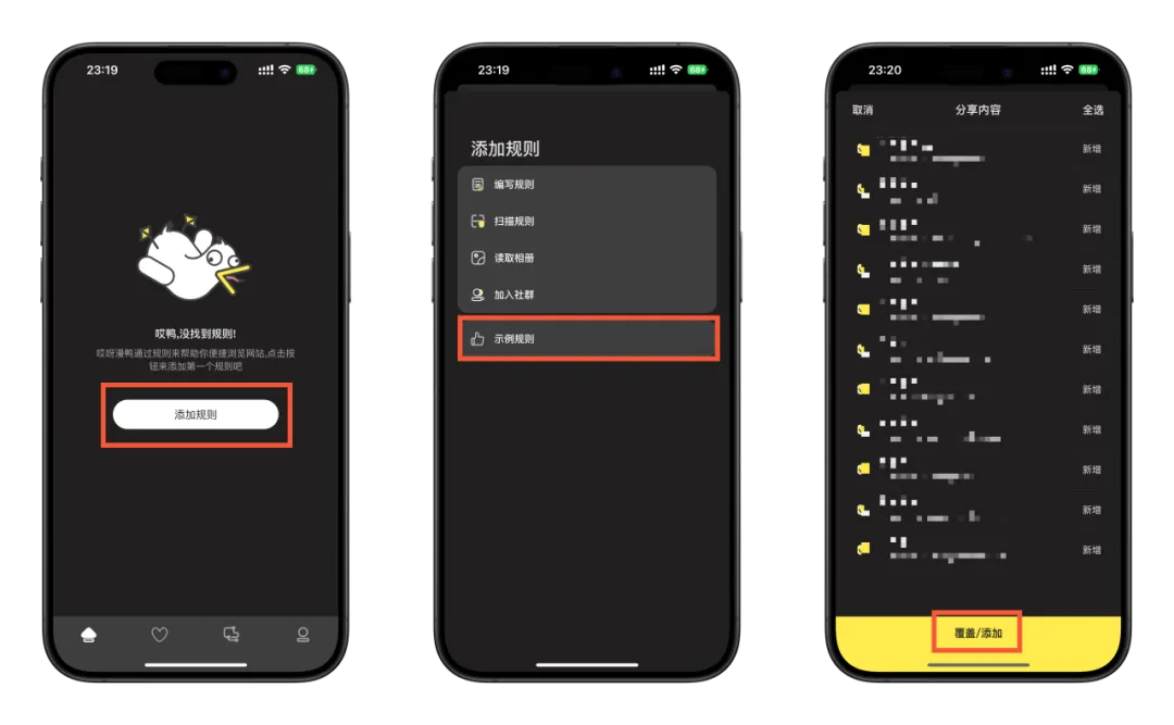 进入应用→添加规则→示例规则→覆盖/添加