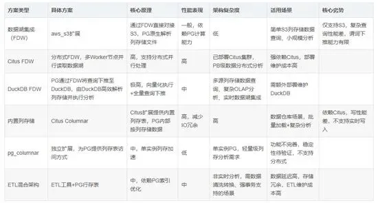 • 资源浪费:若将列存储数据全量导入PostgreSQL行存表,会导致存储成本翻倍,同时占用数据库计算资源,影响核心OLTP业务稳定性。