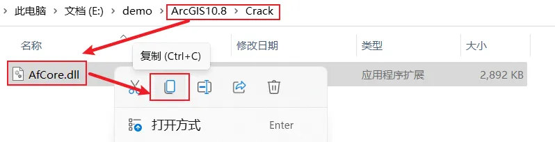 16、在安装包里双击打开“Crack”文件夹,找到并选中“AfCore.dll”文件,鼠标右键点击“复制”或者按CTRL+C。