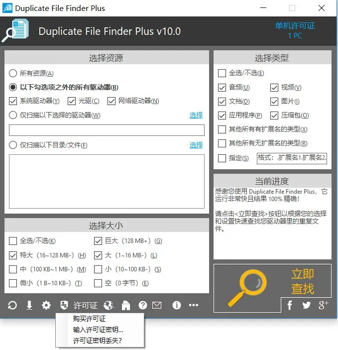 下载之后你会发现它的安装程序非常小,只有648KB,而且安装过程也设置的十分合理。默认语言是简体中文,初次安装时会默认在所选目录下新建名为Duplicate File Finder Plus的文件夹,这是个很不起眼却很贴心的细节。安装完毕后会看到一个简洁清爽的界面,点击下方的许可证,输入我们正版中国提供的激活码即可正常使用了。
