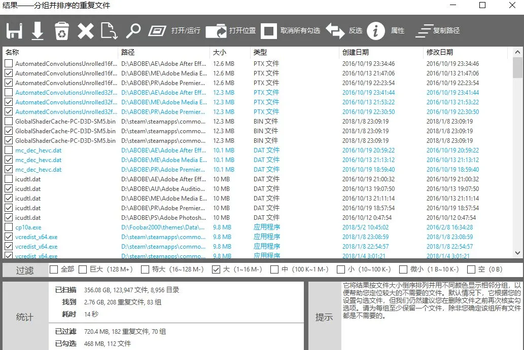 在实际使用的过程中,我们可以根据磁盘位置,文件大小和文件类型来限定筛选条件。筛选结果会细心地用两种颜色分隔分组,并能根据大小进行过滤显示结果,可以选择放进回收站、彻底删除,移动位置、打开位置等等操作,基本囊括了你想要进行的所有操作!你还可以把比较结果保存下来,下次直接调用。