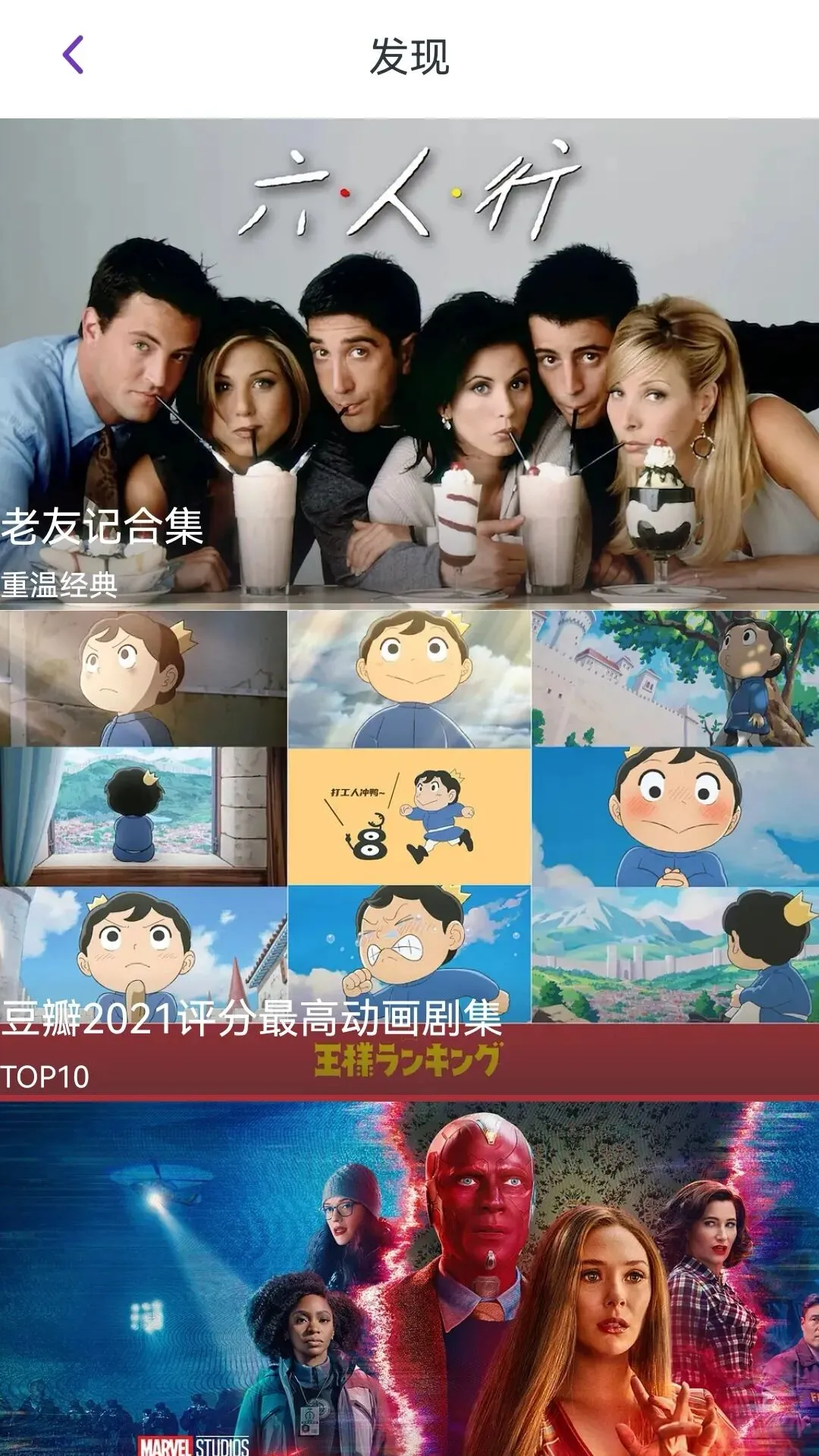 如果不知道看什么也不怕,在发现页会有很多热播评分高的剧集专栏,包含了国产剧、英美剧、动漫,著名演员的作品,再也不用担心会剧荒了!