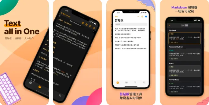 Taio 是一款现代化的文本编辑应用,提供剪贴板、文本编辑和文本动作等功能。Taio 将剪贴板数据作为输入源之一,您可以快速捕捉到剪贴板数据,Taio 中的文本动作是一种强大的机制,为**剪贴板**和**编辑器**提供可扩展性,它的工作原理与 `快捷指令` 应用相同。甚至可以使用 **JavaScript** 编写动作。Taio 中的 JavaScript 引擎由 JSBox 驱动,它提供了大量的接口来与 iOS 交互。目前软件处于开发阶段,免费下载无广告无内购,速度收入。