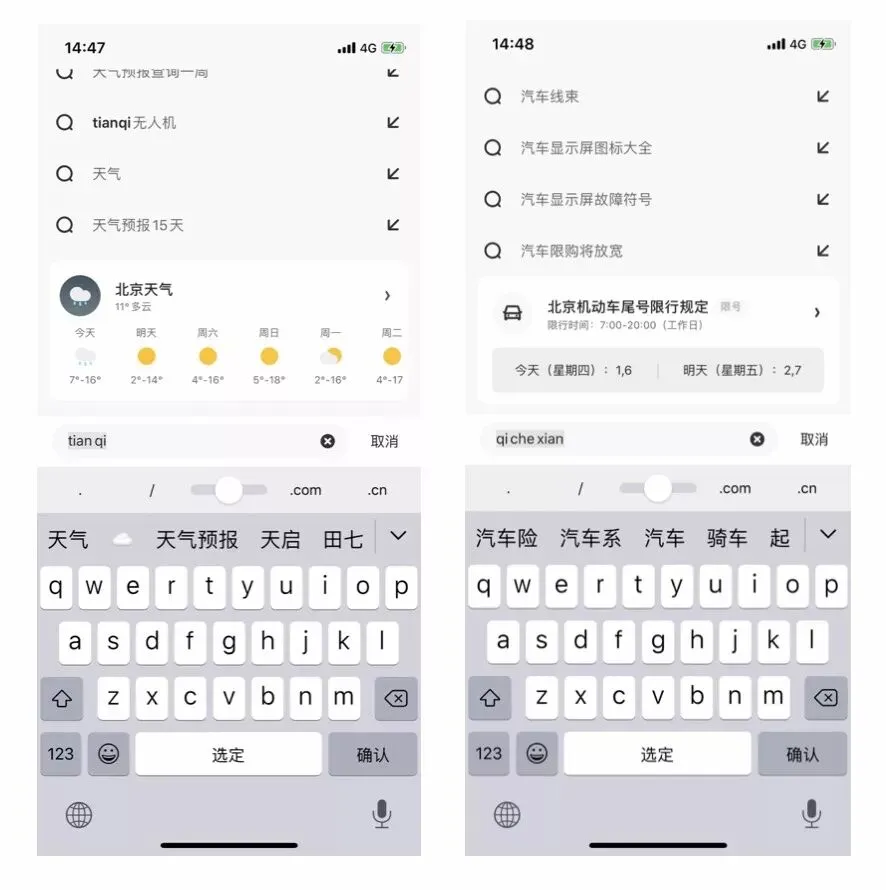 再比如,Apple想要查询一下北京的限行情况,同样在搜索框检索一下,还没等我把文字输完呢,答案“咻”地一下就出来啦,一眼就能瞄到,即搜即得的功能简直不要太好用了。