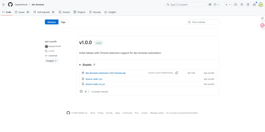 去 GitHub release 页面:github.com/SawyerHood/dev-browser/releases