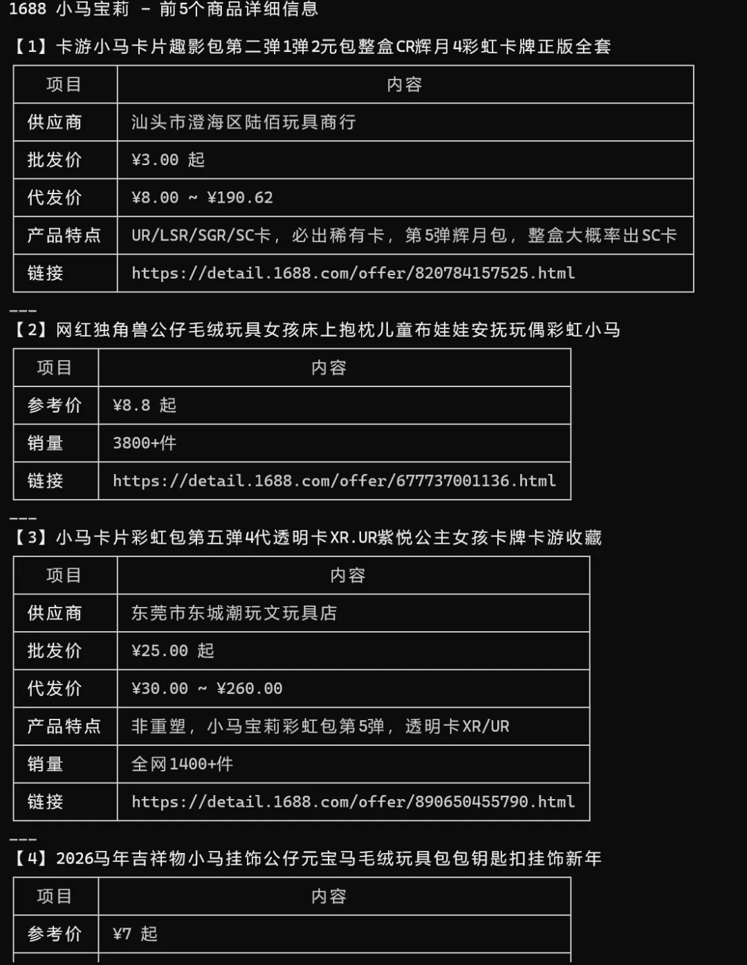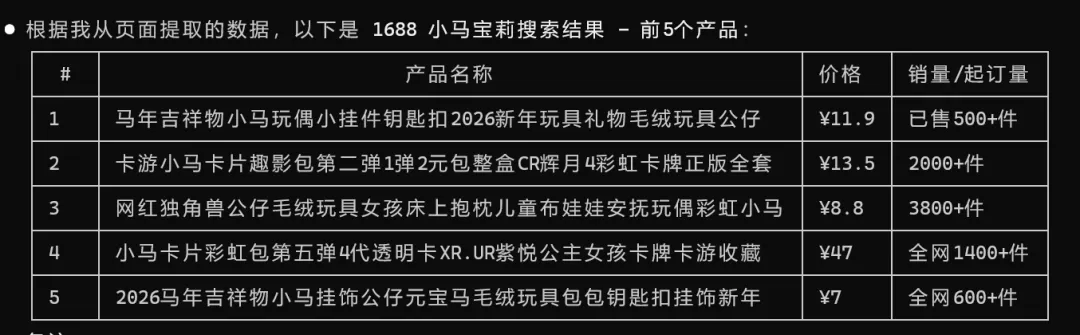 打开 1688 搜寻小马宝丽这个商品,帮我提取前五大产品列表,包括名称、价格、起订量