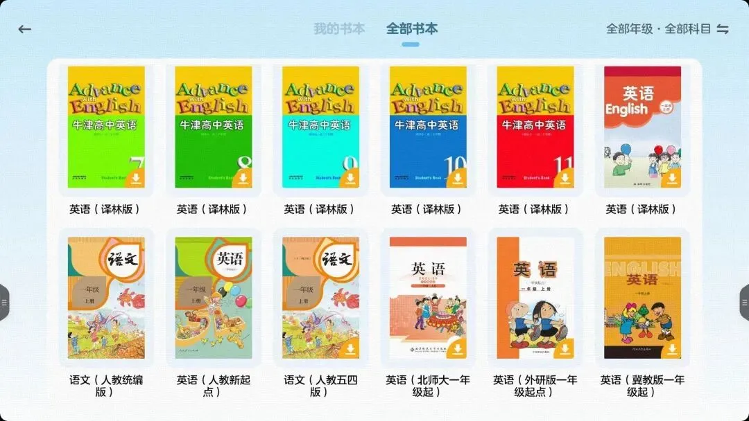 里面的教材包含1-9年级的语文和英文,有人教版、北师版、外研版、译林版等等主流版本教材。