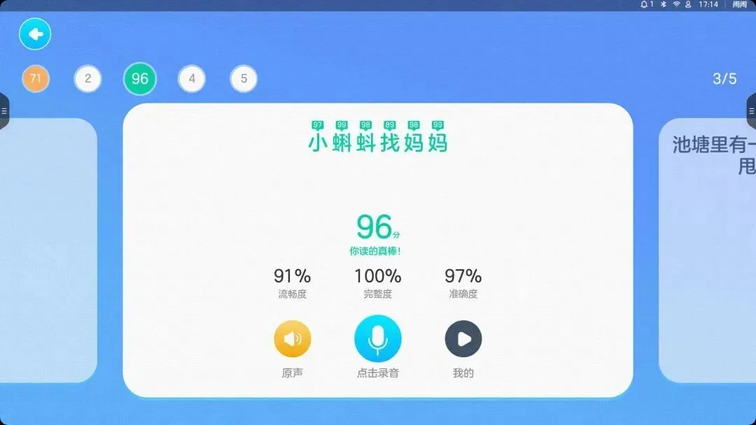 内置资源全部是教材原版音频,支持教材逐段点读、整读、复读等多种模式切换,还能跟读进行AI语音测评,能够帮助孩子掌握发音和提升口语输出能力。