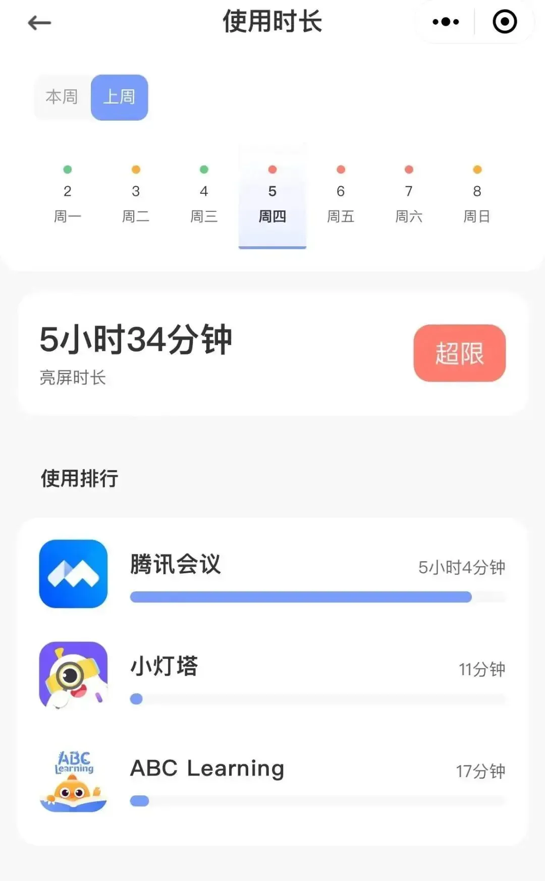 可以看到,之前言言每天居家上网课,用的时间最长就是腾讯会议。另外就是每天固定的小灯塔和ABC Learning学习时间,完全不会看别的乱七八糟的APP。