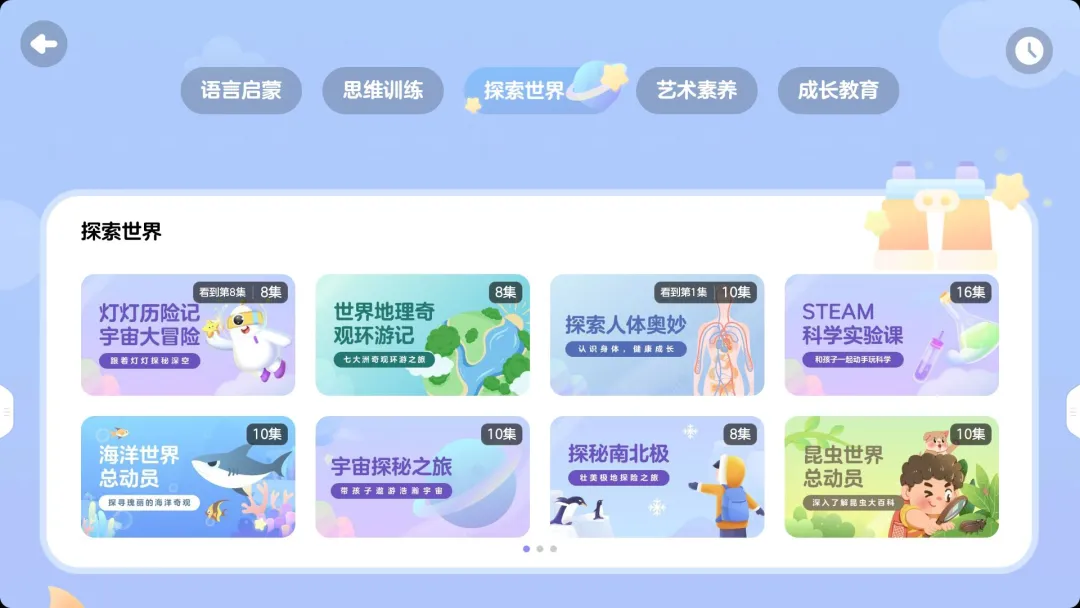 在探索世界模块中,通过动画讲解与实景科普的形式激发幼儿好奇心和探究的兴趣,发展探究和解决问题的能力。
