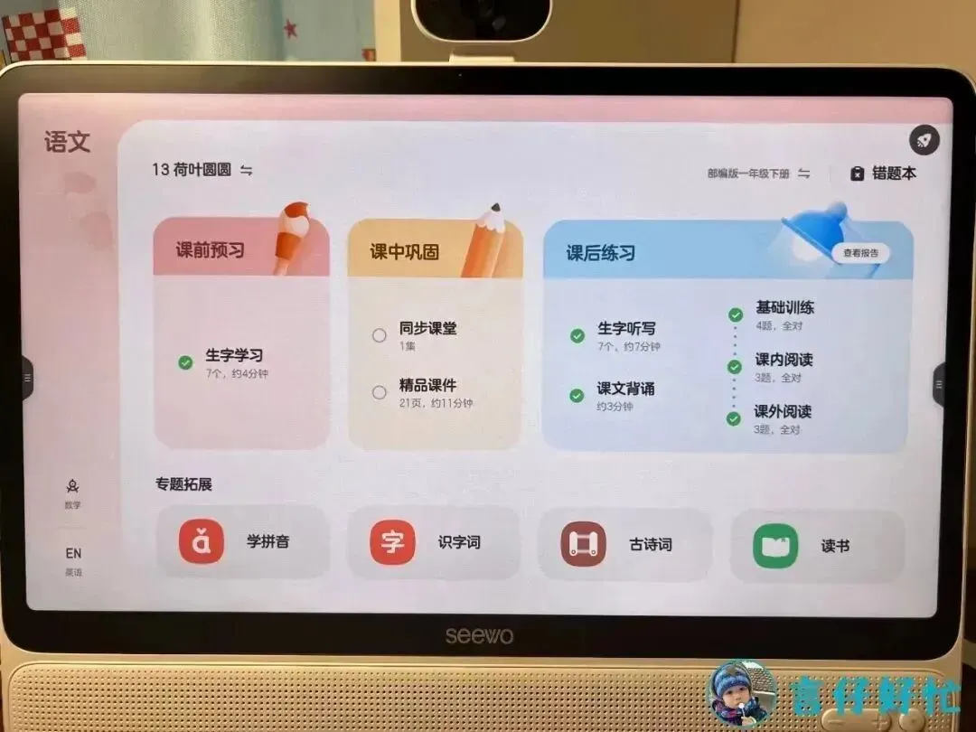 对于上班比较忙的爸爸妈妈来说,如果到家已经比较晚,没有办法和孩子搞课内预习和复习的话,希沃学习机确实能帮不少忙!