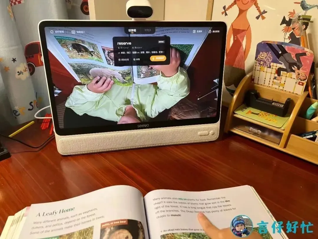 所以如果家里没有小猴点读笔也没有关系,咱们只需要告诉孩子把绘本放置于希沃的镜头前,并开启“绘本伴读”功能就可以点读啦!