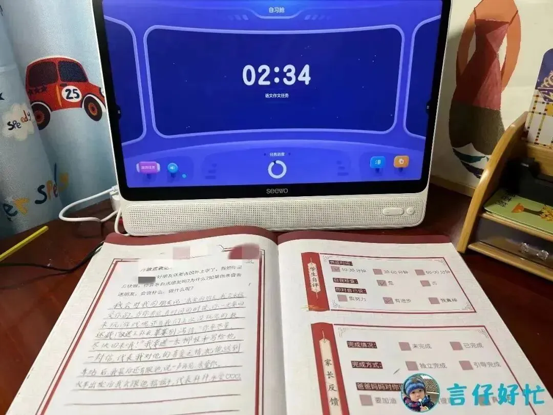 用了自习舱之后,言言的写作精力更加集中,并且提前完成了一篇高质量的作文。