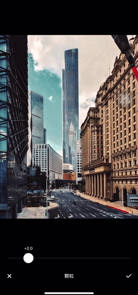 滤镜选择:找到粗粒胶片工具,挑选一个滤镜作为底色,进行微调,明确画面复古胶片感。