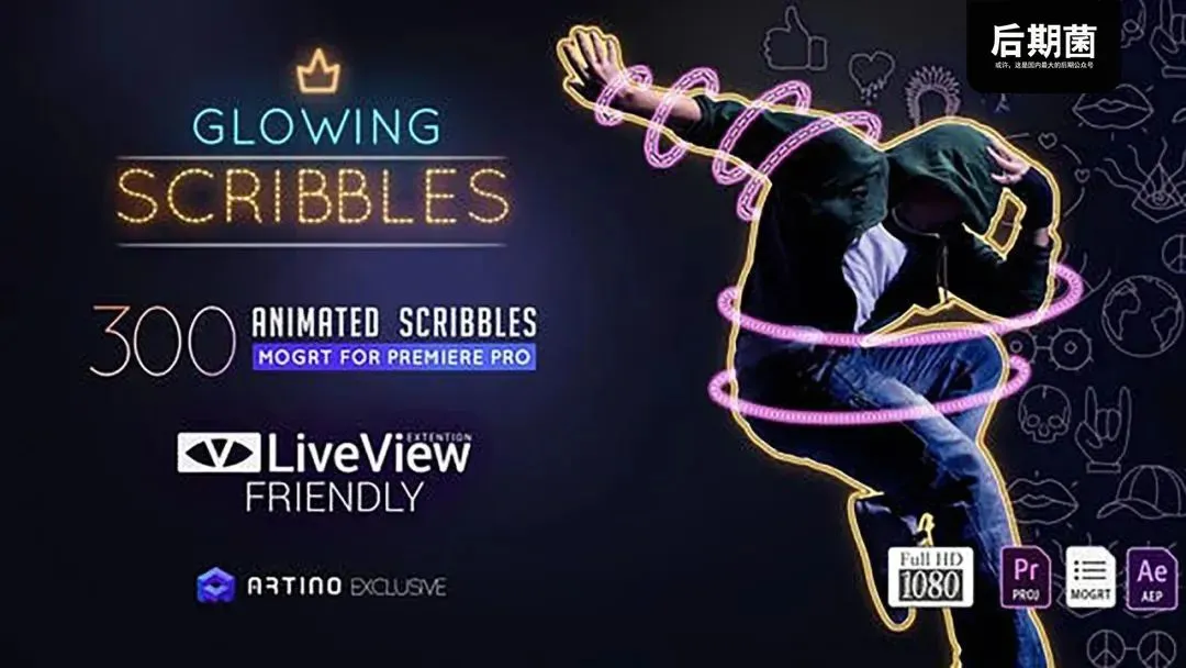 这套发光涂鸦线条描边霓虹图形动画元素工具包,可帮助您创建霓虹灯风格的精美视频。这些完整的程序包包含动画涂鸦:背景,爆炸,边框,气泡,闪电,烟雾,液体,符号,线条动画,文本动画,胡须,眼镜等。