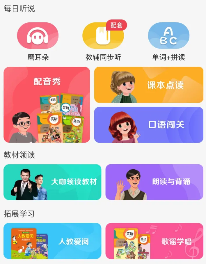 这个app包含了人教版英语课本的所有内容,包括课文、听力、词汇、口语、教材点读、配音、朗读背诵等等。