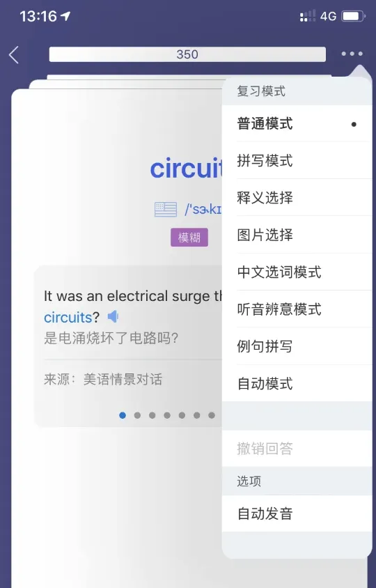 练习单词,还可以选择记忆模式,如拼写、选词等模式,