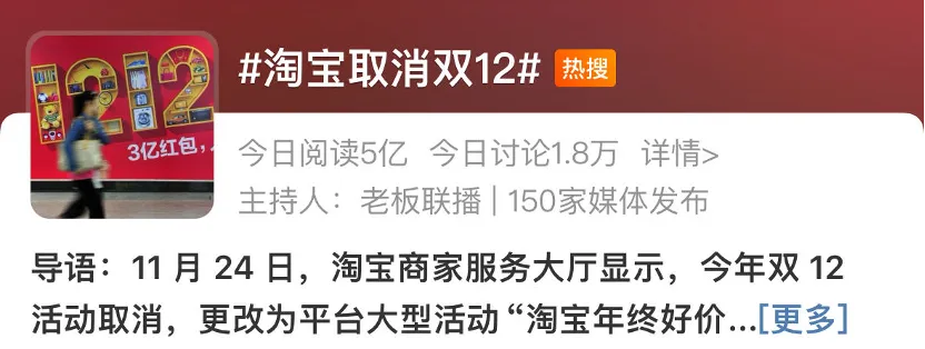 淘宝网商家服务大厅显示,今年“双12”活动取消,更改为平台大型活动“淘宝年终好价节”,预计11月底开始招商。