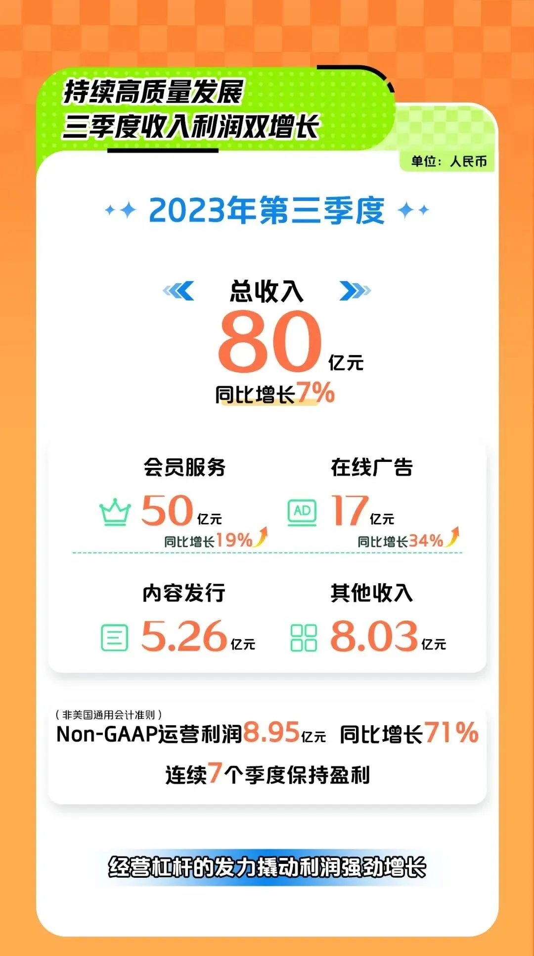 爱奇艺尖叫之夜众星云集,场面火爆,回看爱奇艺Q3的财报,相当高质高量。财报数据显示,本季度总营收80亿元人民币,同比增长7%。当季爱奇艺实现Non-GAAP(非美国通用会计准则)运营利润8.95亿元,较去年同期的5.24亿元,同比增长71%。