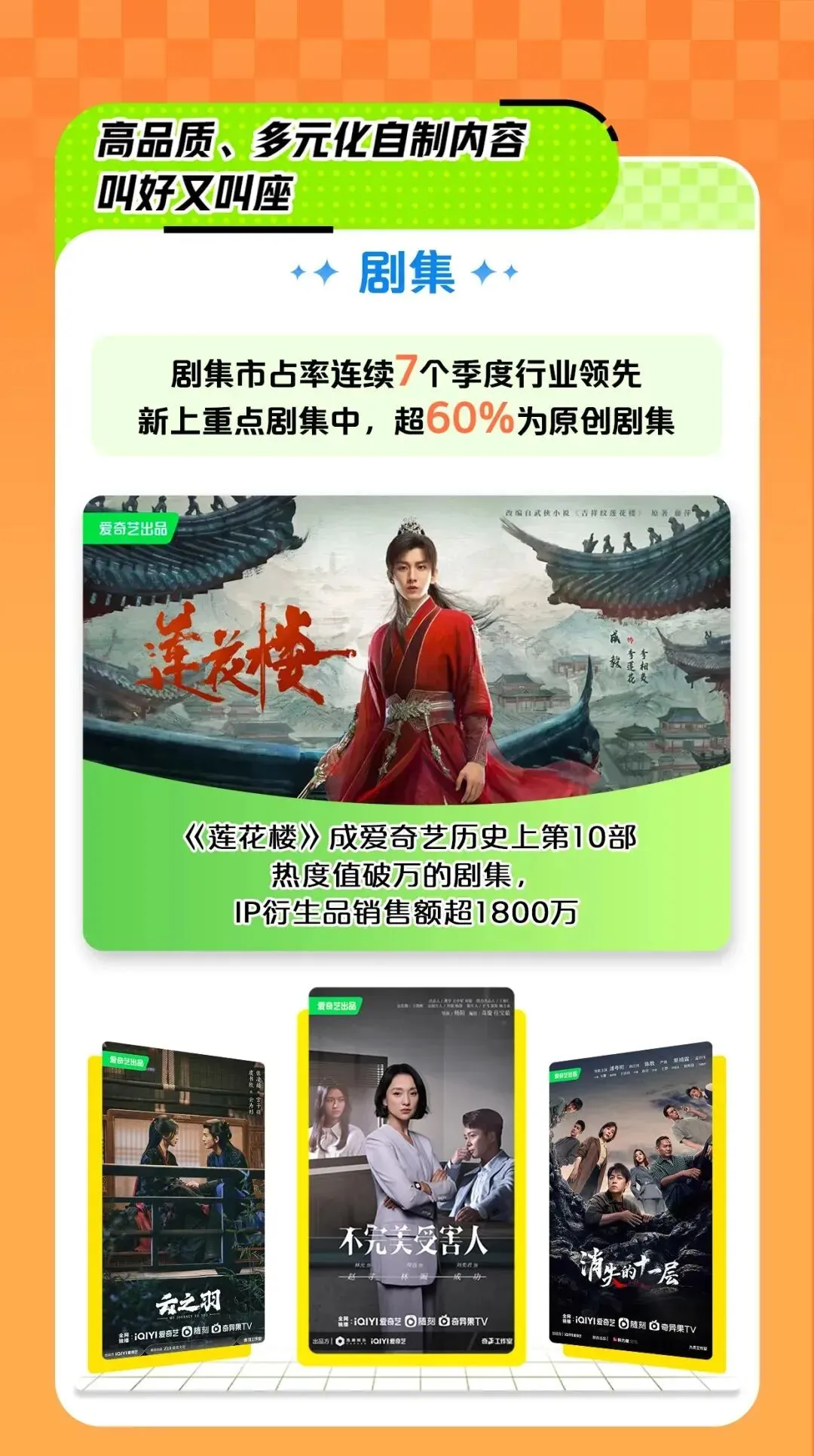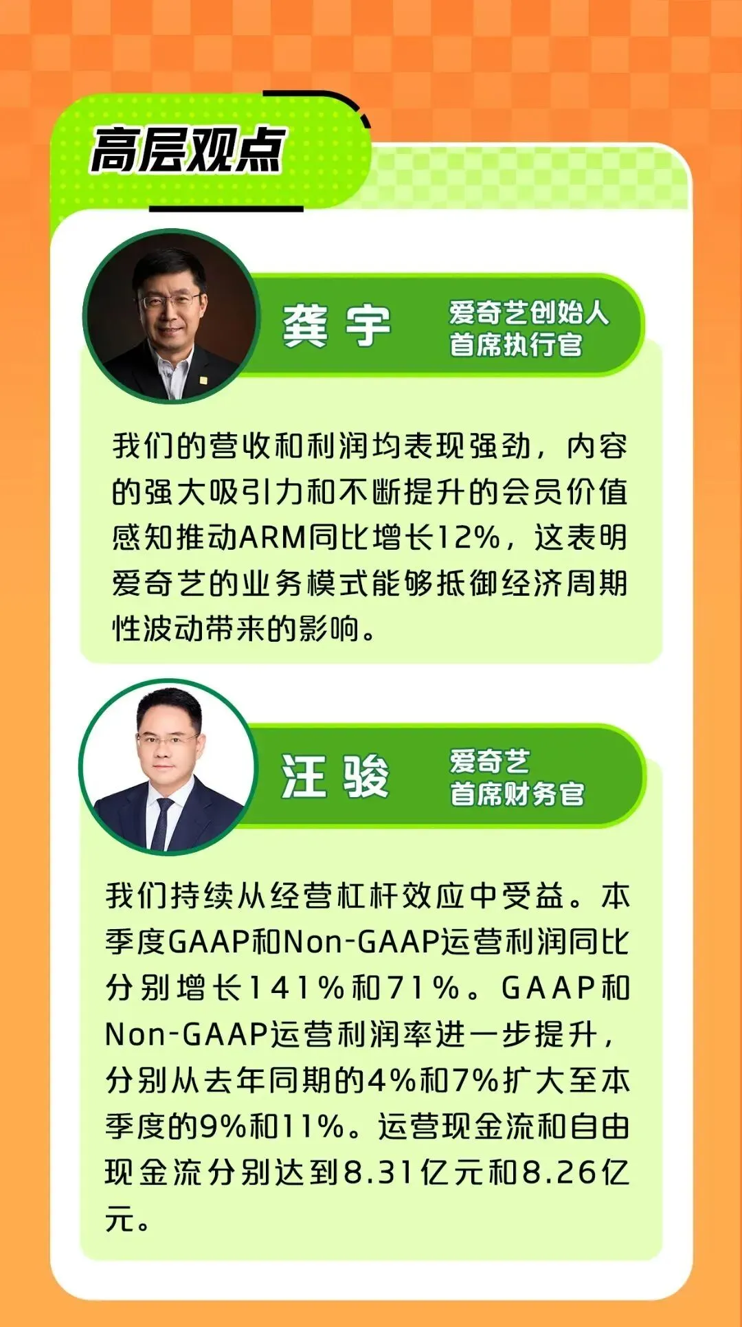 其中营收和利润均表现强劲,内容上《莲花楼》、《云之羽》、《不完美受害人》、《消失的十一层》在古装、悬疑、现实题材等领域持续出品优质原创内容。在未来3-5年中,爱奇艺始终致力于通过技术创新赋能娱乐生态,基于生成式AI技术,爱奇艺在业内率先推出角色搜索、剧情搜索、明星搜索功能,通过AI剧情搜索进入正片的观众,其人均观看时长提升了40%。爱奇艺创始人、首席执行官龚宇表示:“我们正在推动生成式AI在影视行业场景中落地,让影视工业化走上‘快车道’。”