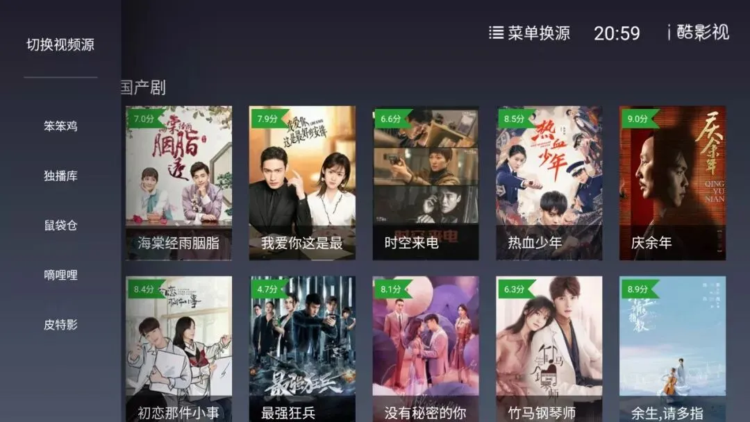 自v1.2.5版本更新后,现在一共有笨笨鸡、独播库、鼠袋仓、嘀哩哩和皮特影五个视频源。点击上方的“菜单换源”可以切换。