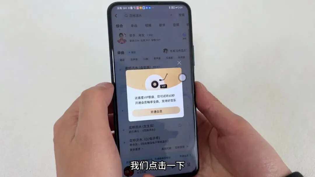 我们打开随意的一个音乐软件给大家看一下,我们点击。随便点击一首歌吧。比如说我们想搜这个花桥流水的歌曲,大家可以看一下,都是需要开通VIP的,我们点击一下是需要开通VIP的,而且的话只能听60秒,就更不可能下载了,遇到这种情况该如何操作呢?