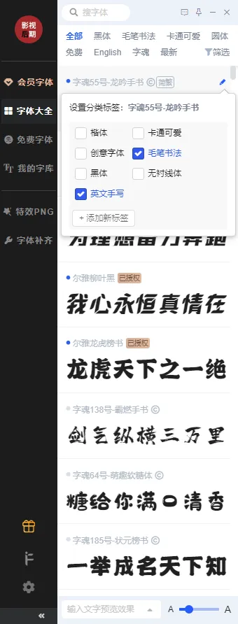 管理字体分类,收藏喜欢的字体,给喜欢的字体打分类标签。