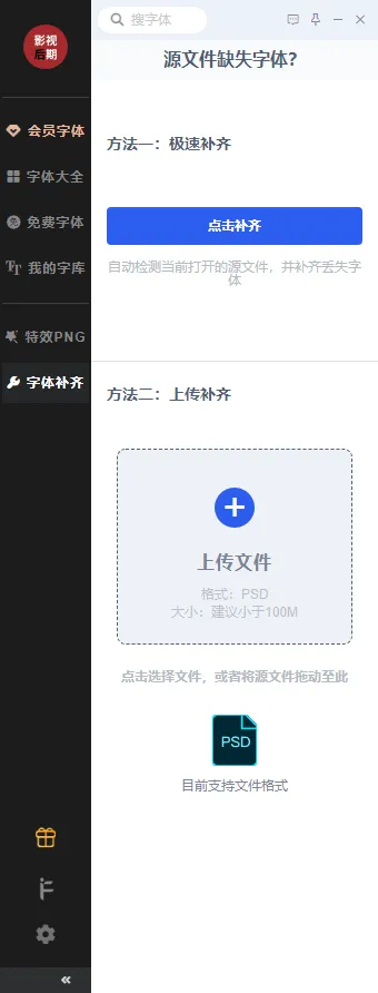 一键缺失字体自动补齐,目前支持PSD文件格式,直接一键智能补齐,在系统智能都没有补齐都情况下,可上传源文件补齐。