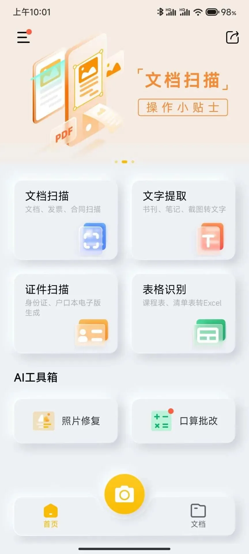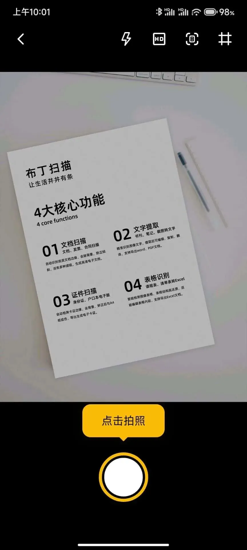 布丁扫描,最早应该是出自vivo家的,不过现在已经是在外独立的产品了。具有四大特色功能:文档扫描、文字提取、证件扫描、表格识别全部免费使用,且都支持批量识别、批量扫描。