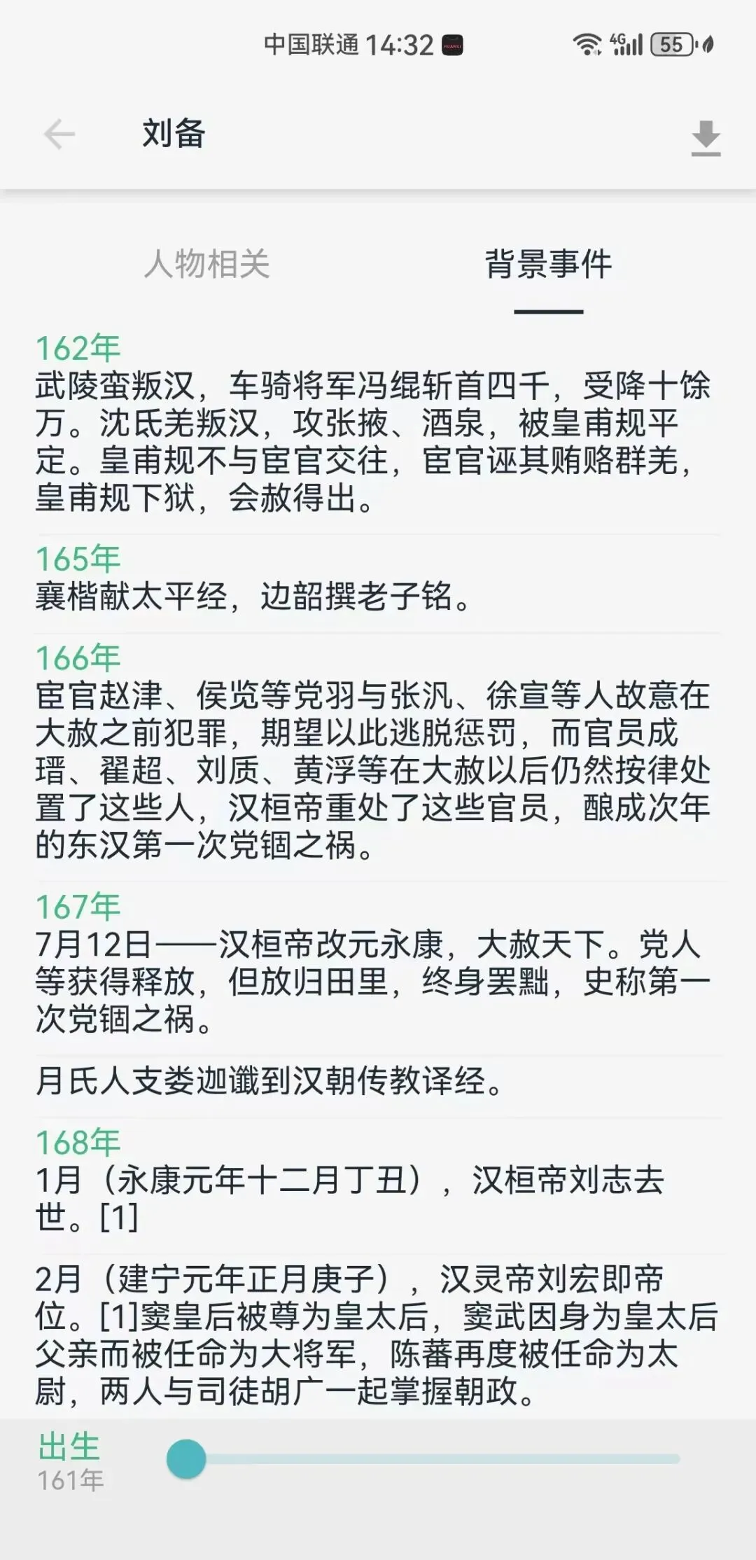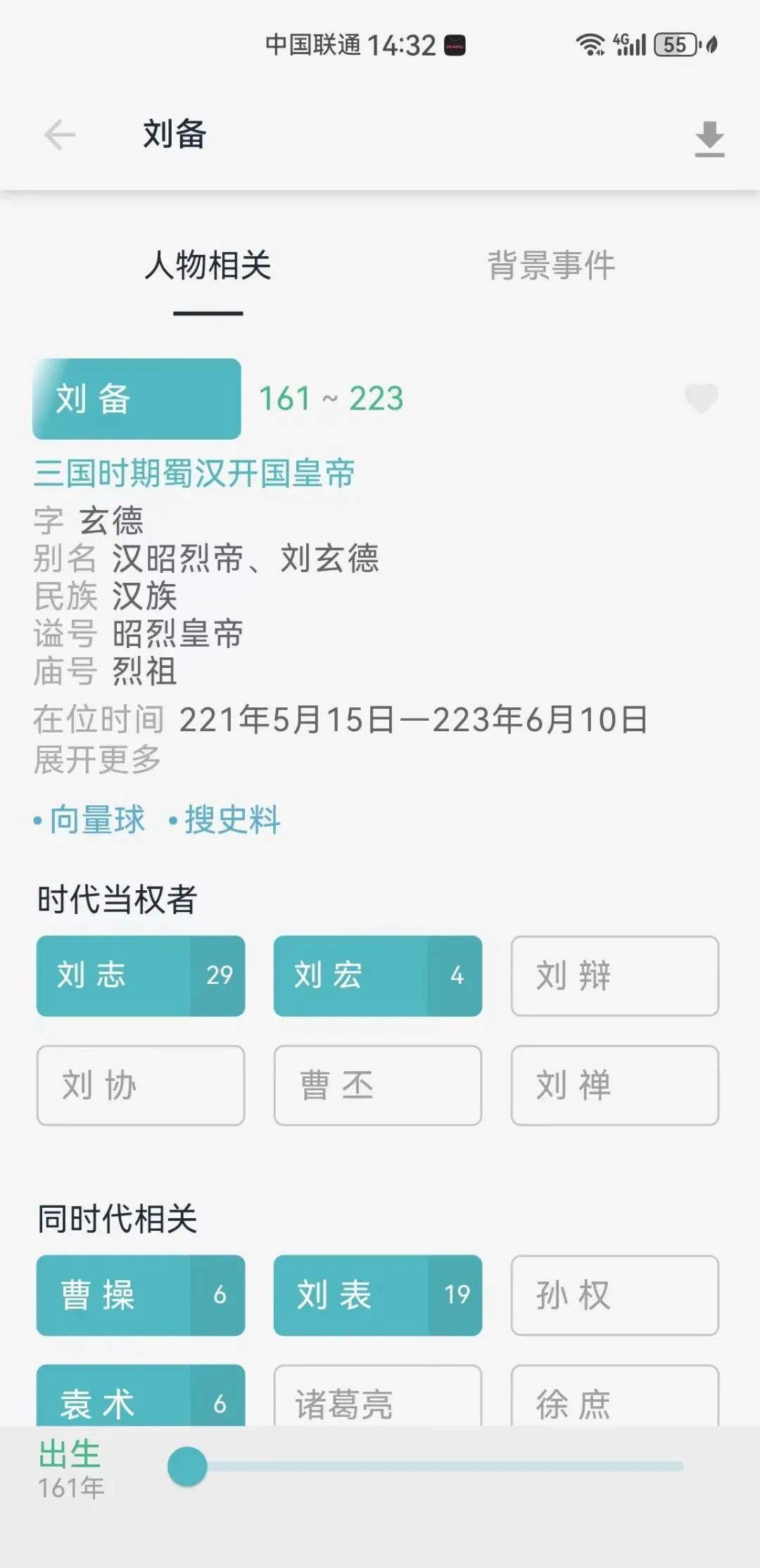 这里汤主给大家以 刘备 为例子,可以看看展示效果。这里直接可以看到刘备人物相关的详细信息,背景事件还可以查看刘备从小到大的重要事件,可以让你全方位的了解到一个历史人物的信息。
