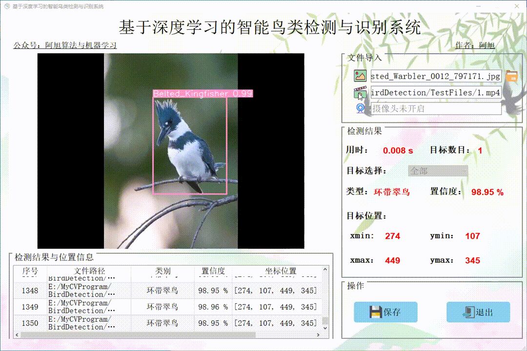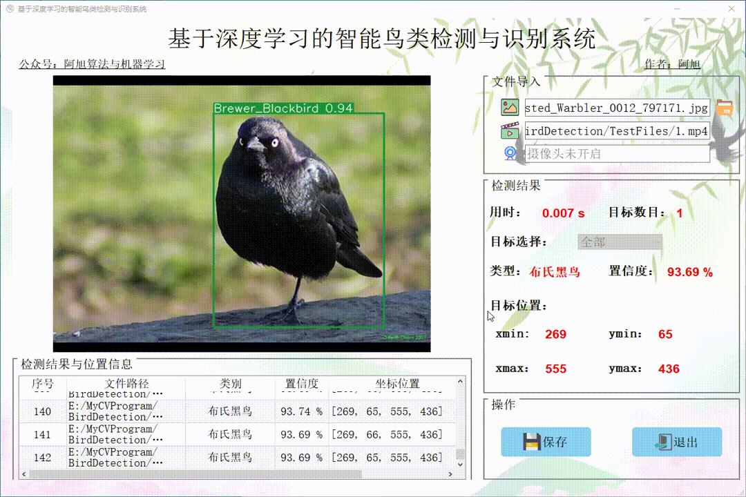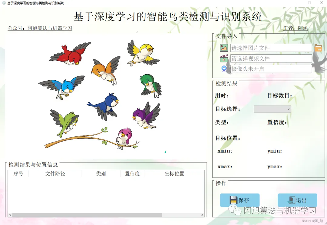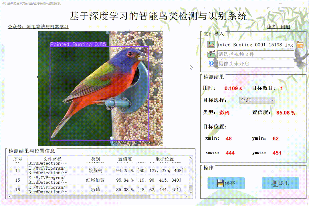 以上便是关于此款鸟类智能检测与识别系统的原理与代码介绍。基于此模型,博主用python与Pyqt5开发了一个带界面的软件系统,即文中第二部分的演示内容,能够很好的支持图片、视频及摄像头进行检测,同时支持检测结果的保存。
