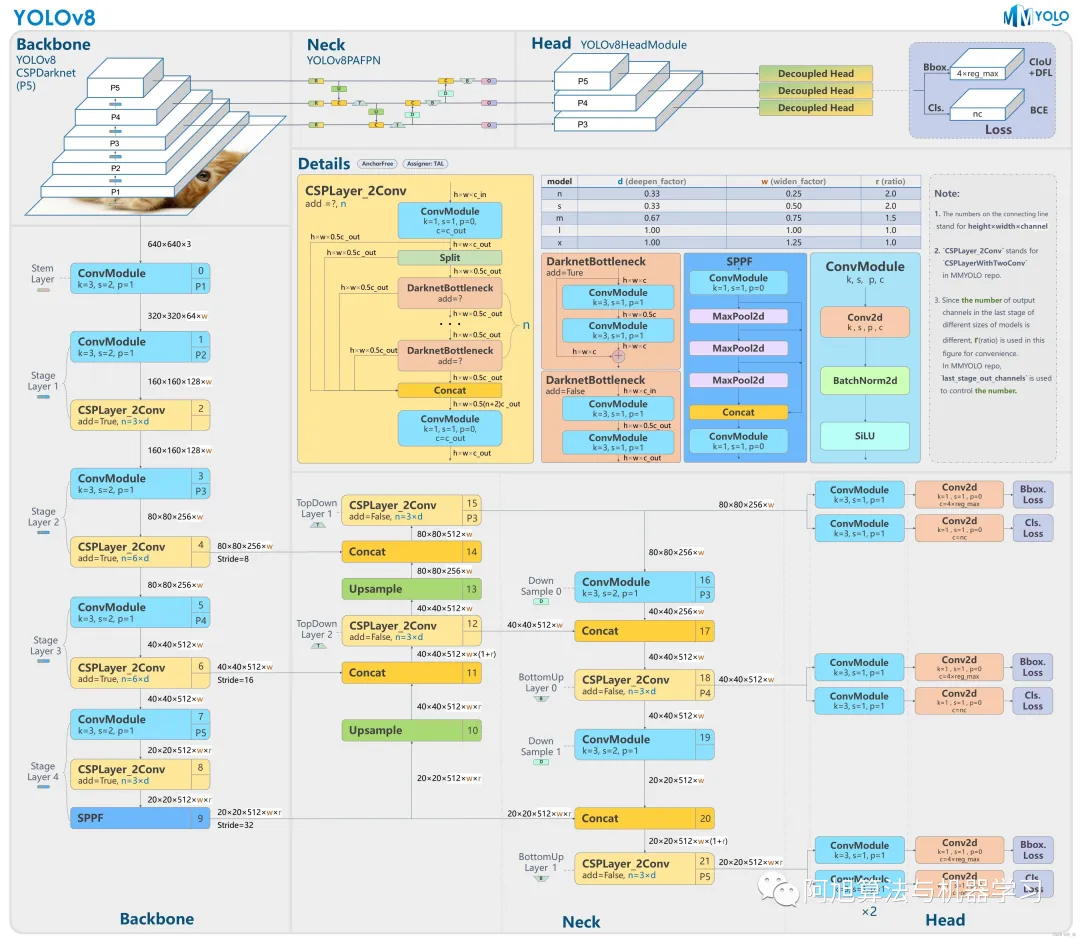 YOLOv8是一种前沿的目标检测技术,它基于先前YOLO版本在目标检测任务上的成功,进一步提升了性能和灵活性。主要的创新点包括一个新的骨干网络、一个新的 Ancher-Free 检测头和一个新的损失函数,可以在从 CPU 到 GPU 的各种硬件平台上运行。其主要网络结构如下: