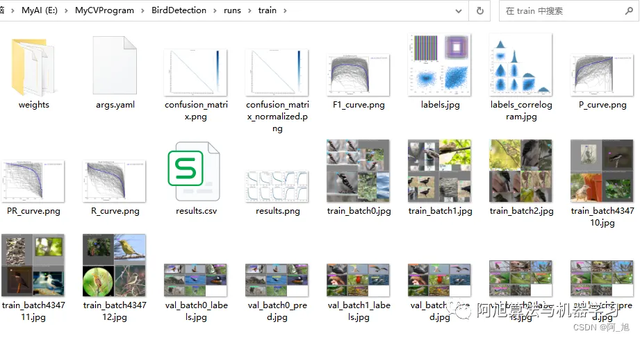 在深度学习中,我们通常用损失函数下降的曲线来观察模型训练的情况。YOLOv8在训练时主要包含三个方面的损失:定位损失(box_loss)、分类损失(cls_loss)和动态特征损失(dfl_loss),在训练结束后,可以在runs/目录下找到训练过程及结果文件,如下所示: