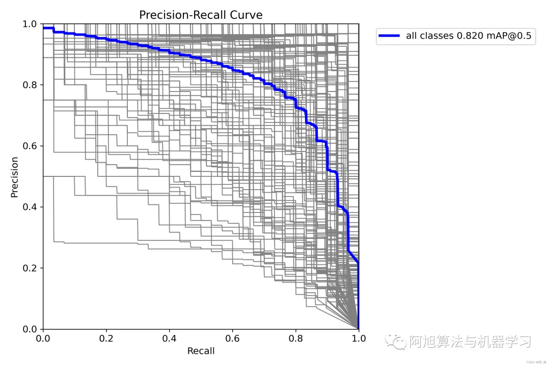 我们通常用PR曲线来体现精确率和召回率的关系,本文训练结果的PR曲线如下。mAP表示Precision和Recall作为两轴作图后围成的面积,m表示平均,@后面的数表示判定iou为正负样本的阈值。mAP@.5:表示阈值大于0.5的平均mAP,可以看到本文模型目标检测的mAP@0.5平均值为0.82,结果还是很不错的。