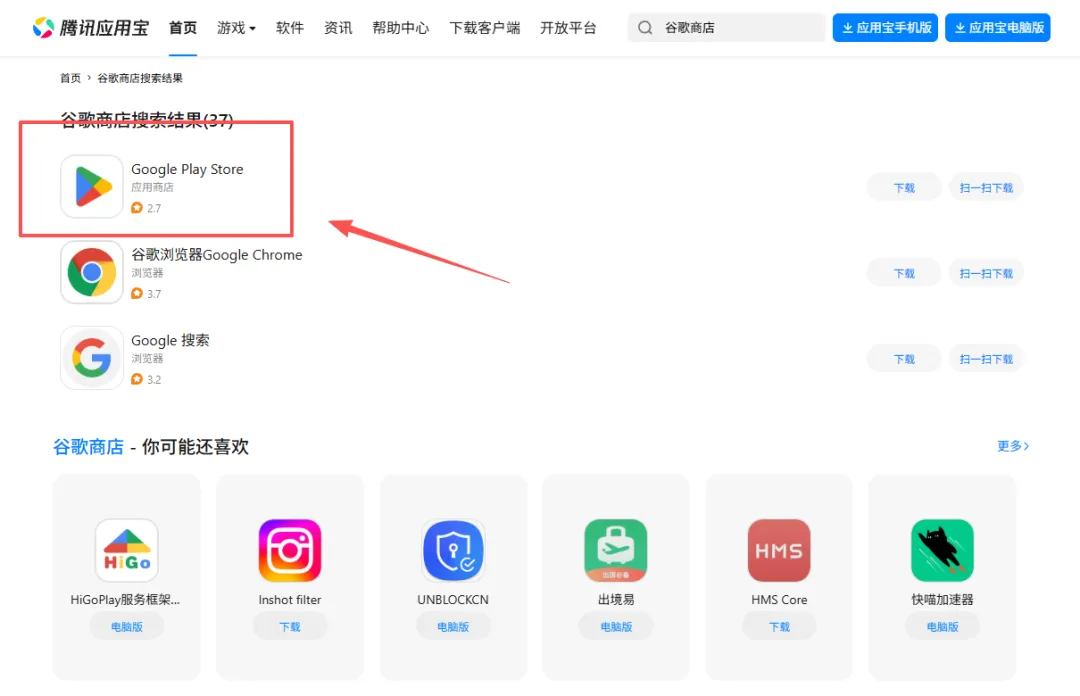 1. 打开安卓手机自带的应用商店 → 搜索”Google Play商店” → 安装或者更新