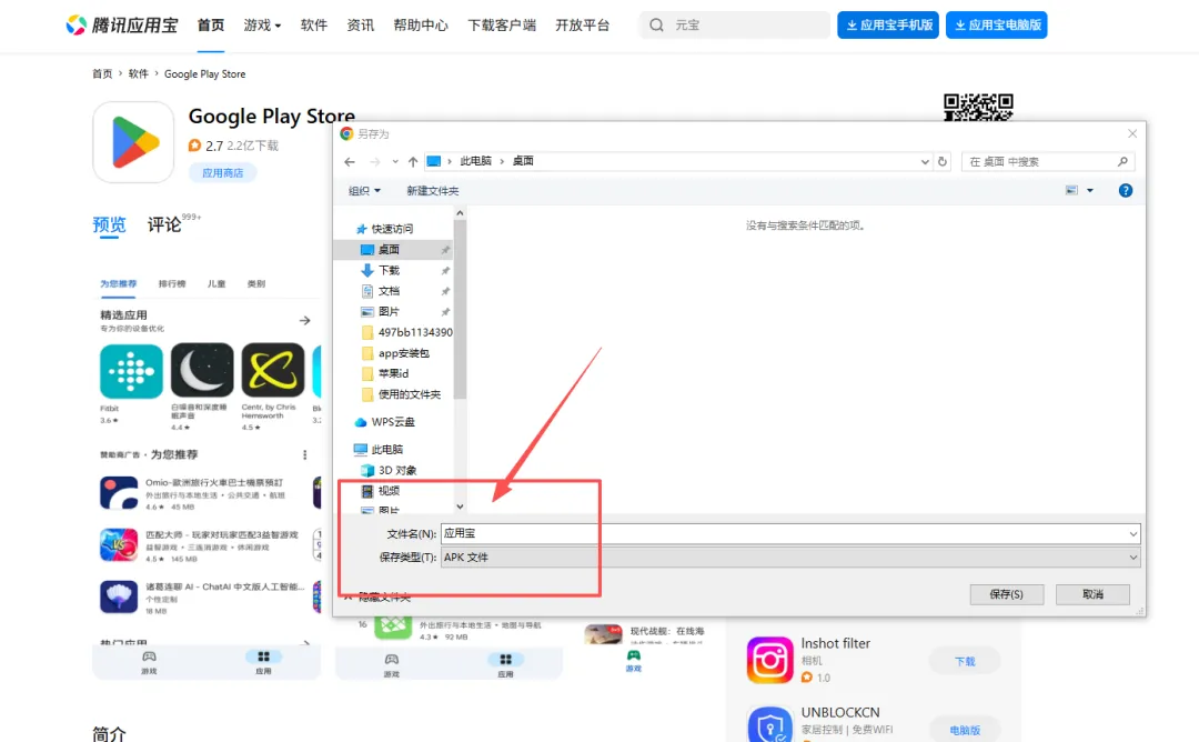 在腾讯的应用宝网站里面搜索 “谷歌商店”,就会跳出 Google play store,手动选择应用宝手机版,选择下载APK后,将APK安装包传到想要安装的手机就可以直接安装了。