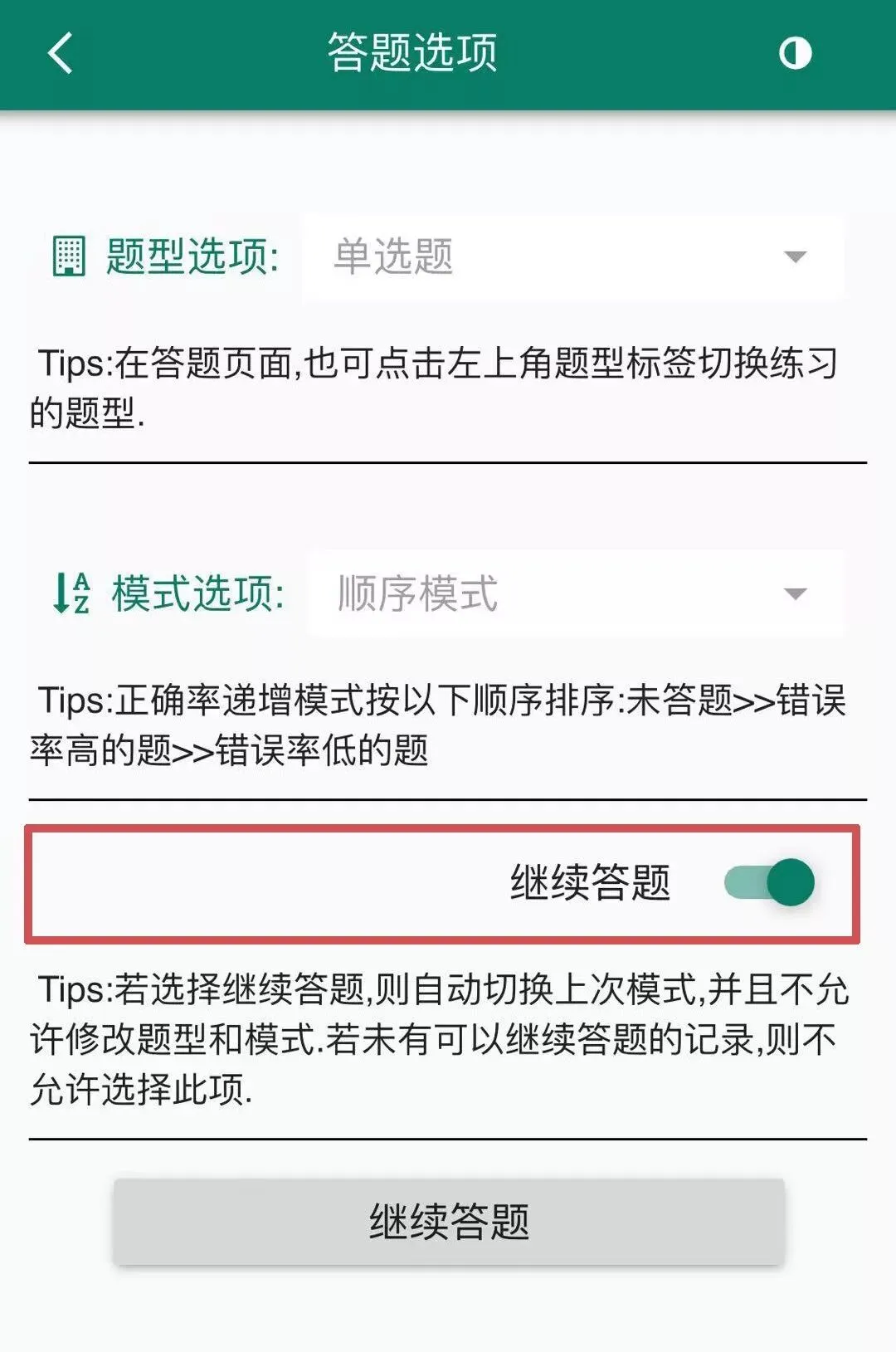 随机模式下退出答题不能继续怎么办?本APP提供了正真意义上的继续答题功能,不论是顺序练习还是随机练习,都能记录完整的答题状态!
