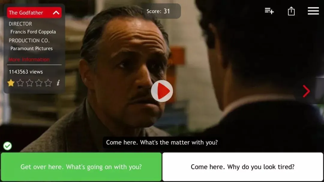 该视频取自于某电影片段,包括1句或者多句台词,这一遍是无字幕播放。第一遍播放完毕之后,会出现倒计时,以及视频下方会出现是否需要台词提示。