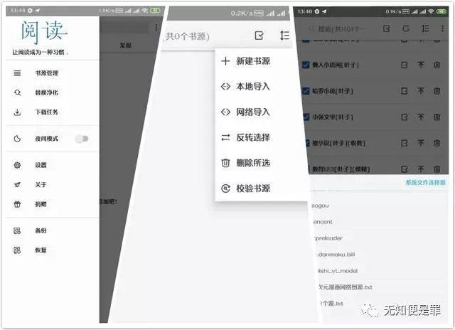 第二款的是安卓手机上的阅读,这是一款开源软件,之前也已经提到过了,这里就不详细都说了,导入方法,同样的是点击左侧的书源管理。选择本地导入,然后选择sd卡中的书源文件,单击就可以了。
