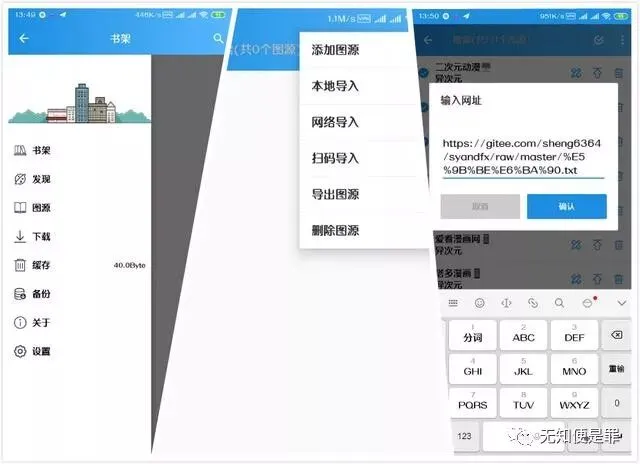 第三款漫画软件叫做异次元漫画,苹果用户可能要难过一下了,因为它只支持安卓版本。同样跟上面的软件类似,选择图源,然后选择网络导入,将网络图源地址复制进去就可以了。