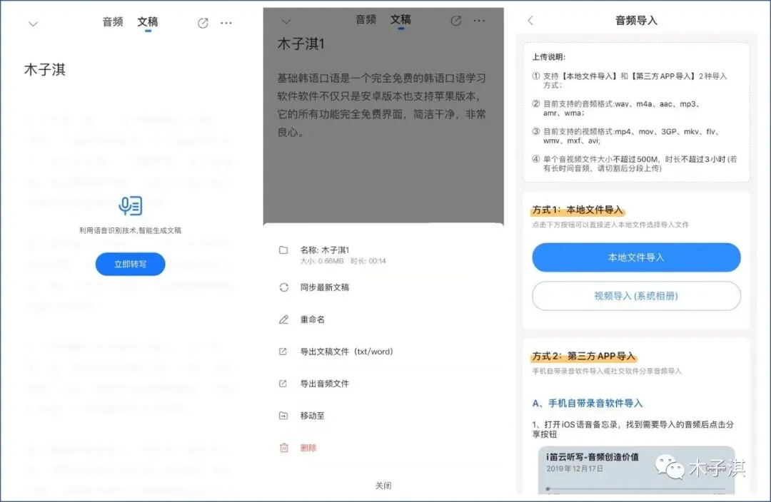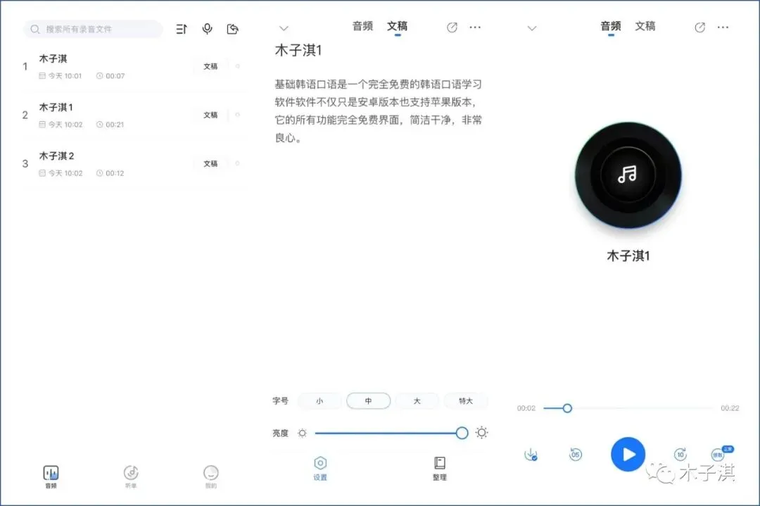 它支持音频和文稿一起保存,你可以倍速播放音频,导出音频文件,也可以整理文稿、导出文稿文件。