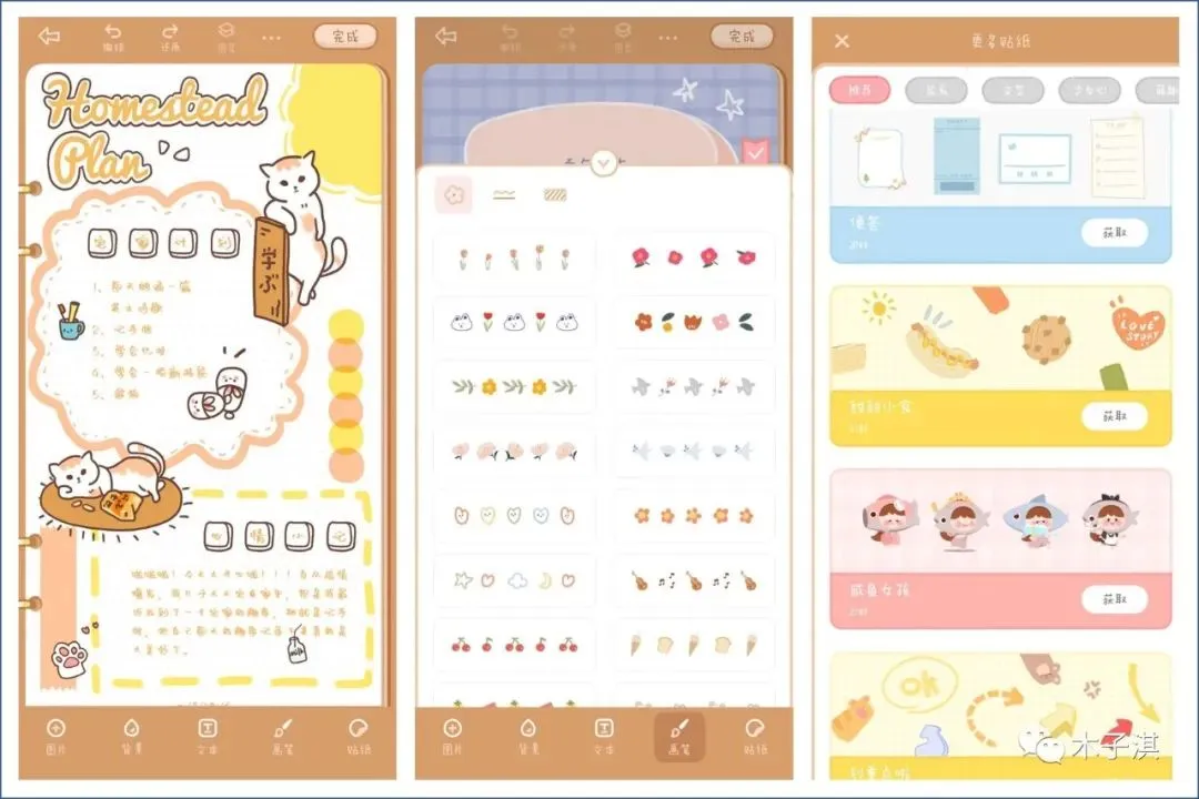 它提供了丰富免费的手帐模板,新颖可爱的手帐本封面、手帐贴纸、背景、画笔素材。
