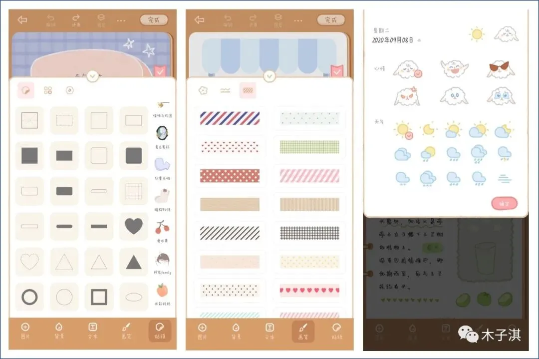 最后,设置编辑完成,你需要给手帐写一个标题,也可以选择日期、天气、心情,然后可以保存手帐,分享手帐。