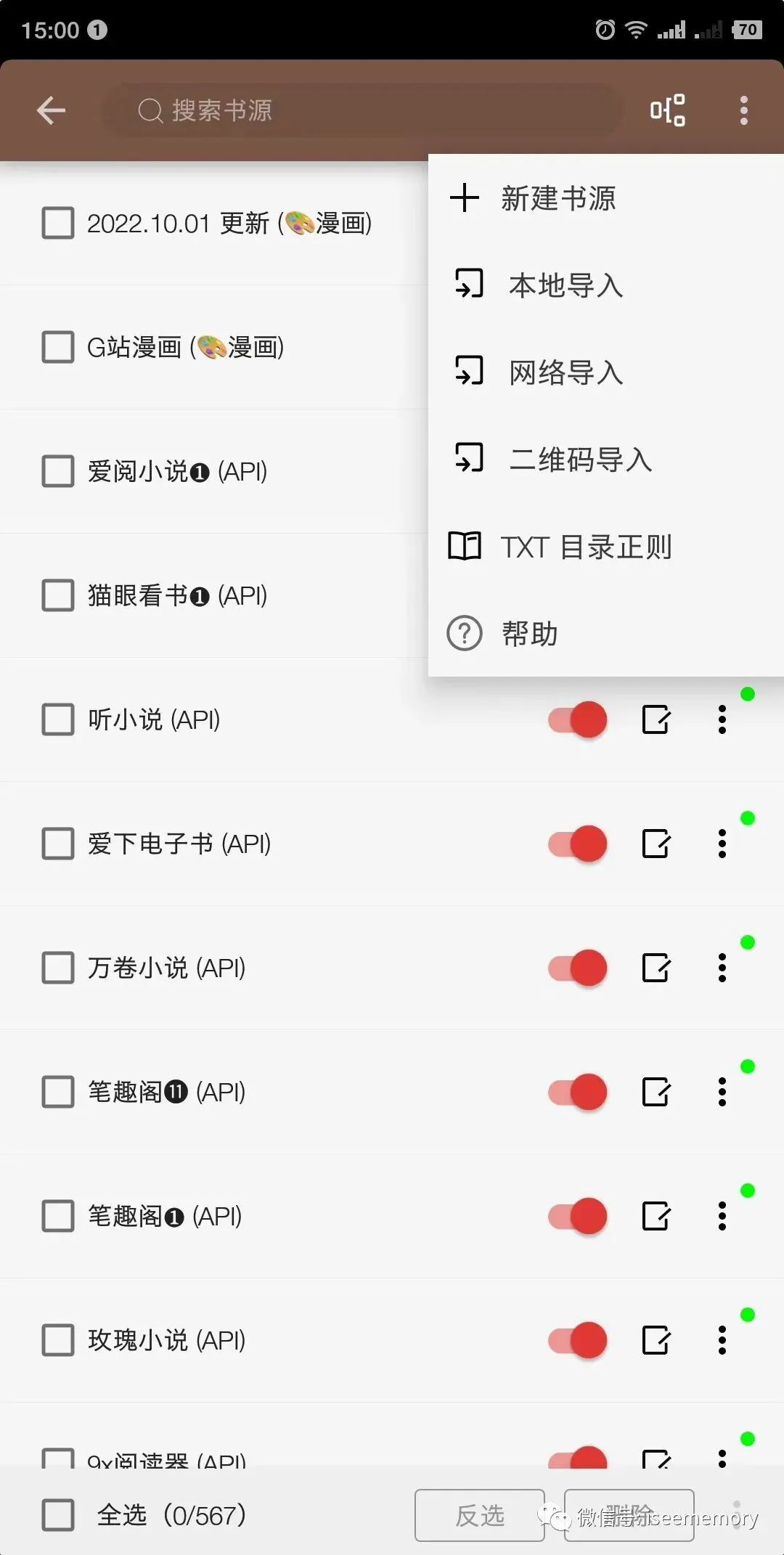 这个就是小编导入一部份后的书源,导入书源有好几种方法,小编介绍更简单的方法给大家,小编一会分享的书源都是TXT格式的,我们只需要电脑下载好书源,然后发送到微信中,像下面这张图。