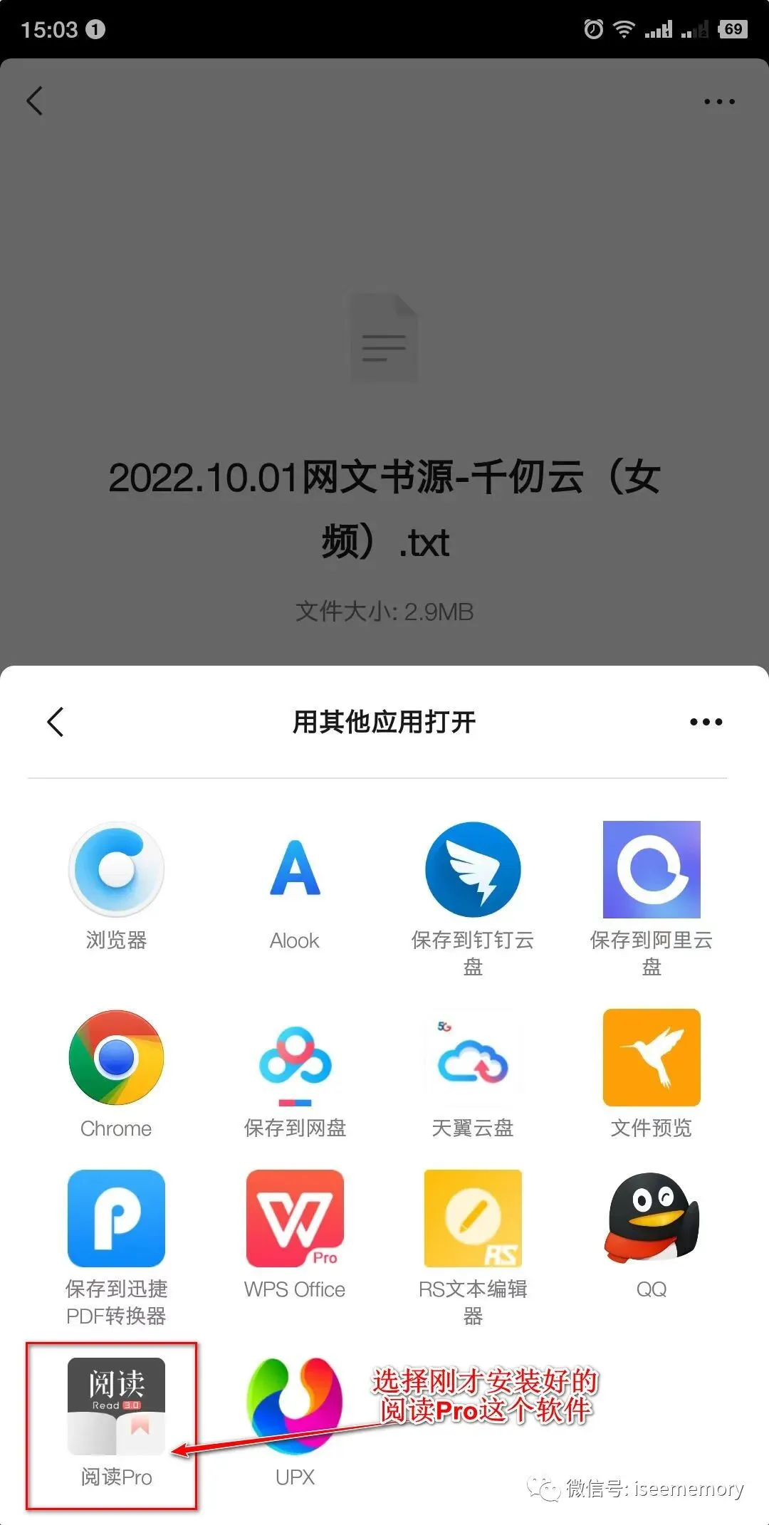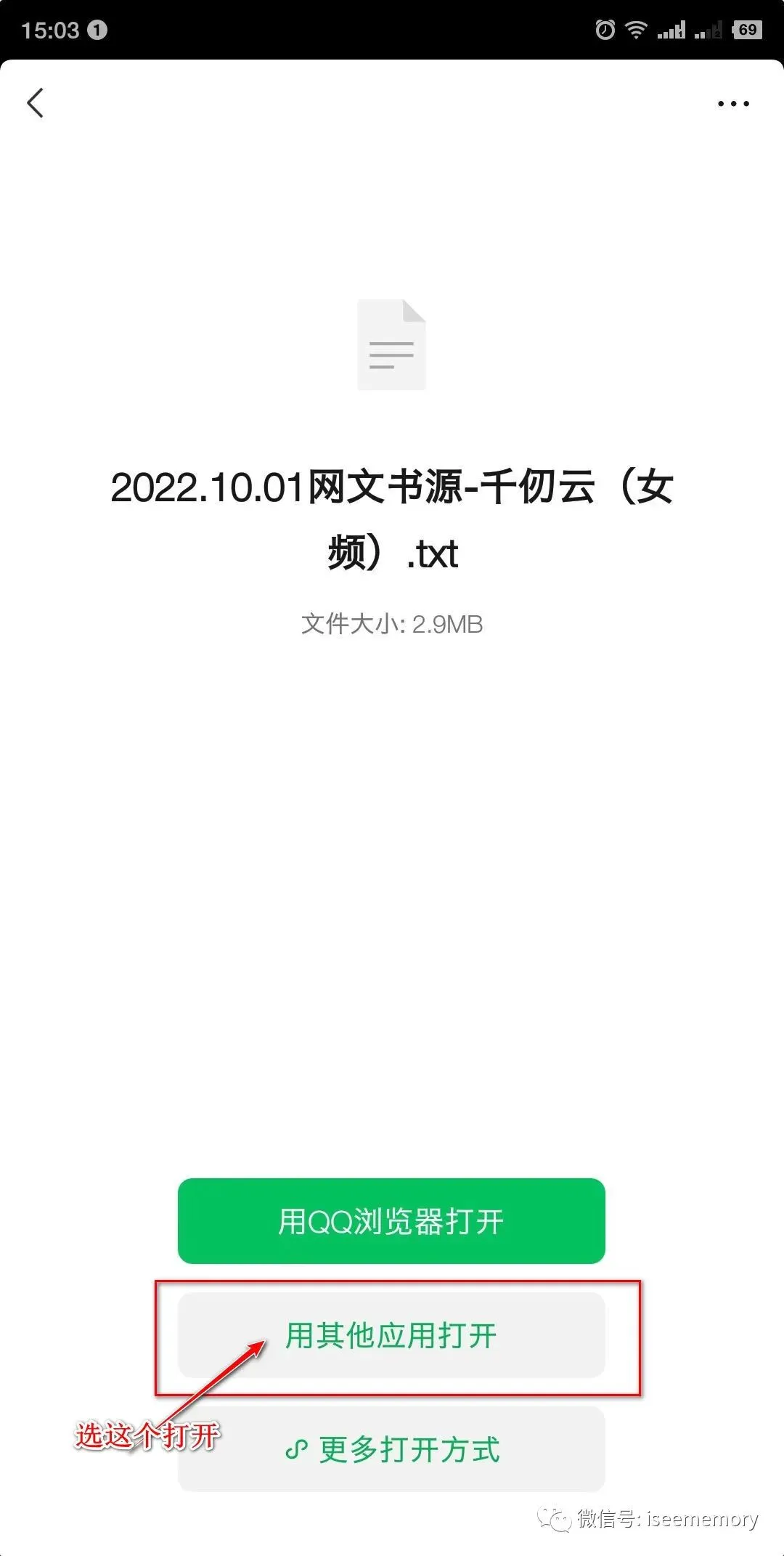我们点一下发送过来的书源,微信会让我们怎么打开,我们选第二个,用其他应用打开。