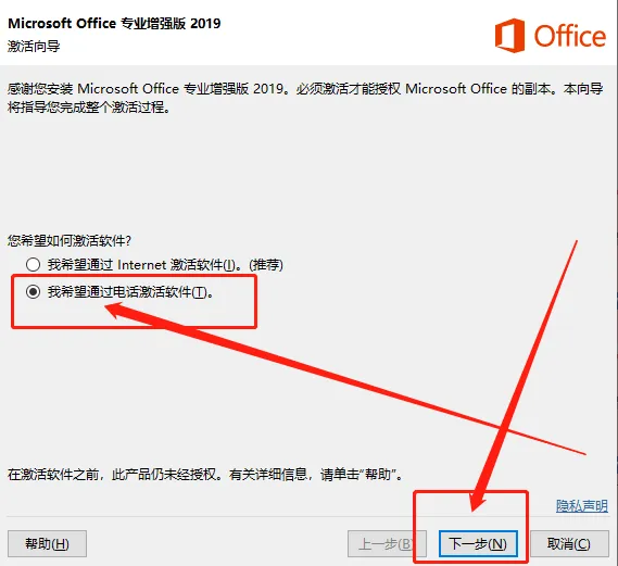 【点击我希望通过电话激活软件】下一步