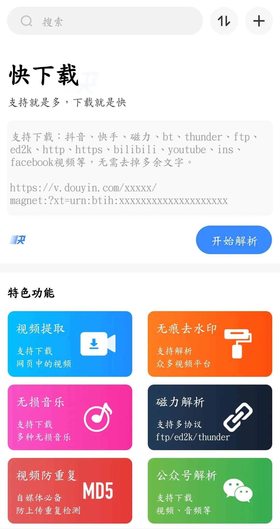 一款拥有全能下载相关功能的神器,支持解析下载,支持视频去水印下载,同时拥有可以搜索电影 音乐 网盘下载等,软件免费使用的,也没有会员机制,软件UI界面做的也挺不错的。