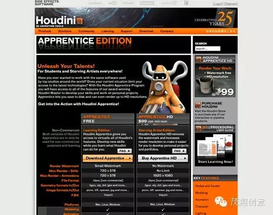 Houdini是一款三维计算机图形软件,由加拿大Side Effects Software Inc.(简称SESI)公司开发,SESI公司由Kim Davidson和Greg Hermanovic创建于1987年。Houdini是在Prisms基础上重新开发而来,可运行于Linux, Windows, Mac OS等操作系统,是完全基于节点模式设计的产物,其结构、操作方式等和其它的三维软件有很大的差异。Houdini自带的渲染器是Mantra,基于Reyes渲染架构,因此也能够快速的渲染运动模糊、景深和置换效果。 Mantra是经过产品验证的成熟渲染器,可以满足电影级别的渲染要求。当然,Houdini也有第三方渲染器的接口,比如:RenderMan、Mental ray、Vray和Torque等,可以把场景导出到这些渲染引擎进行渲染。网址:http://www.sidefx.com/index.php?option=com_download&task=apprentice&Itemid=208